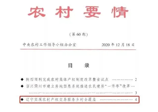 近日,中央农村工作领导小组办公室印发的《农村要情》第60期刊登了《辽宁实现农村产权交易服务乡村全覆盖》,对辽宁省依托沈阳农村综合产权交易中心,建成“省市县乡四级监管、省市县乡村五级联动”的农村产权交易网络信息服务平台,实现农村产权交易省域全覆盖及搭建农村产权交易“政府监管+市场交易”运营模式取得的交易经验和工作成果给予充分的肯定。