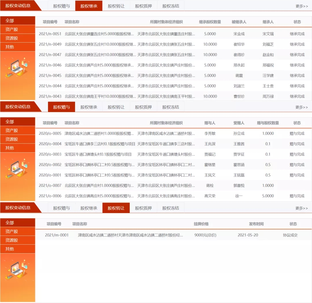 近期,由BB贝博艾弗森官网打造的天津农村产权交易平台成功为津南区咸水沽镇二道桥村股份经济合作社成员办理了股权转让变更手续,标志着全国首笔村集体经济组织股权转让项目交易完成。至此,天津市村集体经济组织股权托管交易平台已实现股权继承、股权赠与、股权转让三大股权变更业务全覆盖。其中股权继承56笔,总价值454556.66元,股权赠与13笔,总价值13600.68元,股权转让1笔,总价值9000元。