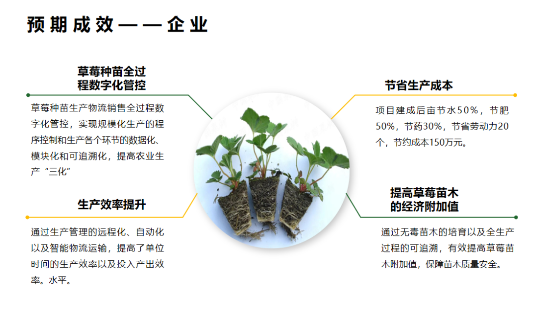 利用信息技术、物联网、云计算、大数据等技术手段,为产业生产全过程配套数字化设备,搭建智能监测、控制、服务、管理平台系统,集成展示草莓苗木数字生产、数字监管、数字仓储、数字交易、数字消费等内容,推行一部手机、一个触摸屏、一个码、一张图的时空信息管理模式,促进草莓育苗产业实行生产精准化、经营智慧化、销售精品化、服务在线化,从而提高农业生产效率和质量,促进农业可持续发展。