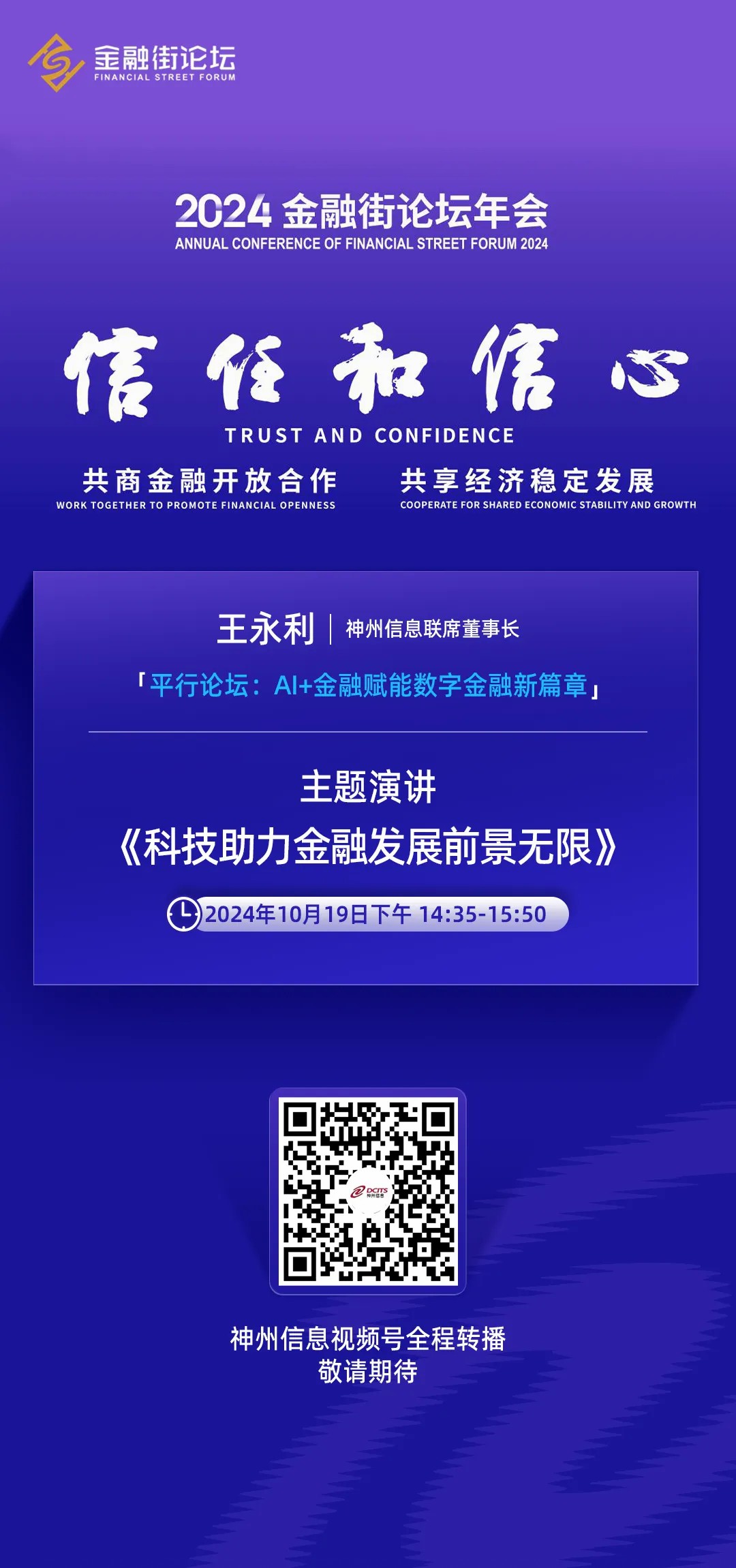 以“信任和信心——共商金融开放合作 共享经济稳定发展”为主题的2024金融街论坛年会将于10月18日至20日在北京金融街举办,BB贝博艾弗森官网受邀参与多项活动。10月19日下午14:00,平行论坛——AI+金融赋能数字金融新篇章,BB贝博艾弗森官网联席董事长王永利将发表主题演讲,BB贝博艾弗森官网视频号全程同步转播,敬请关注。